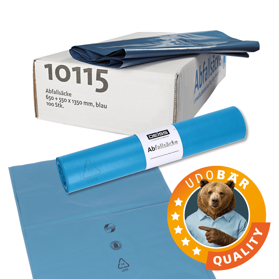 Les sacs poubelles UDO BÄR, résistants à la déchirure, garantissent une élimination fiable et hygiénique des déchets au bureau comme dans l’industrie – robustes, disponibles en différentes tailles et épaisseurs.